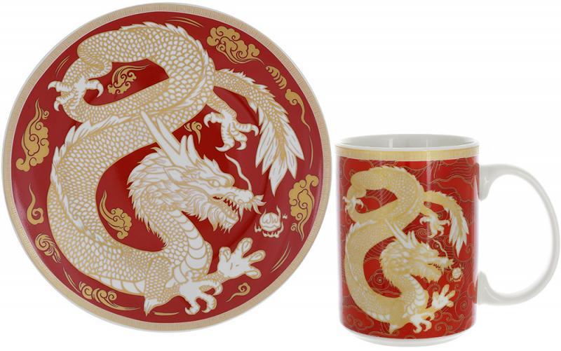 Кухоль із десертною тарілкою "Золотий Дракон на червоному" — чайна порцелянова пара з китайським символом на червоному тлі із золотим декором. Класичний циліндричний кухоль із повним об'ємом 500 мл і десертна тарілочка Ø20 см. Чайний подарунковий набір упакований у стилізовану коробку та може стати чудовим подарунком.